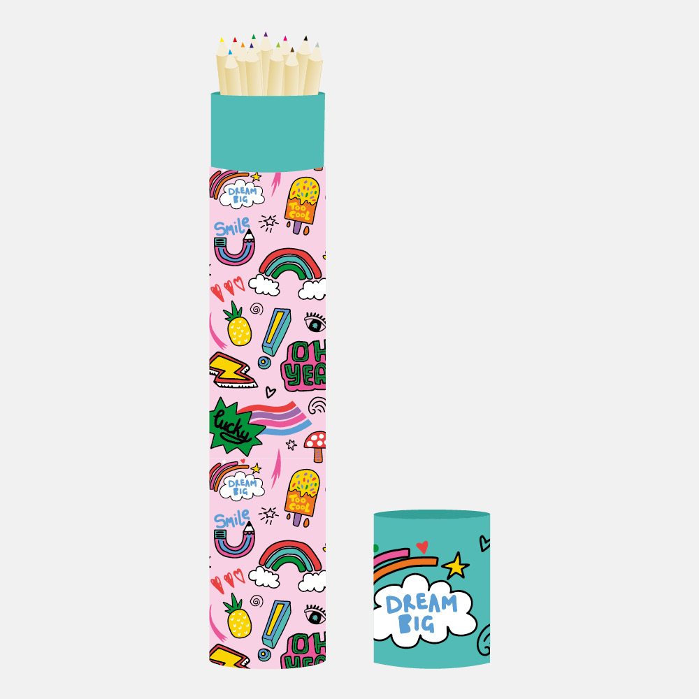 Our pencil pot counter display is pre-filled with 24 pots of the same design. This is the perfect accessory to brighten up your desk. The set has 12 full-sized coloured pencils, in the fun designed tube.